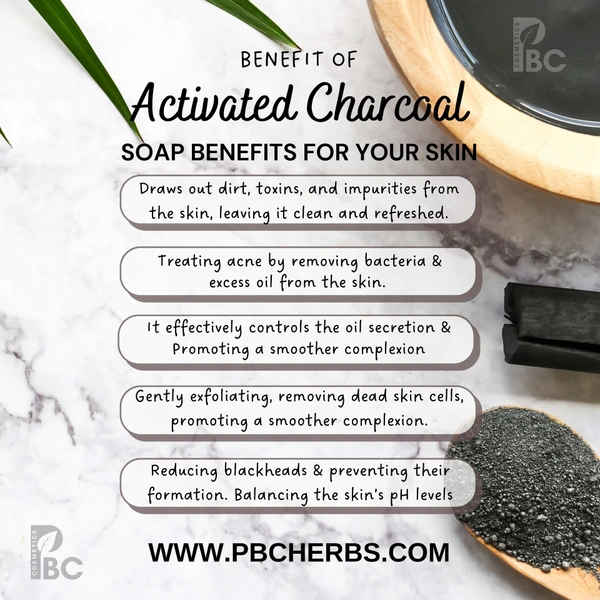Organic charcoal soap offers a range of benefits for the skin due to its natural and purifying properties. Firstly, activated charcoal, the key ingredient in this soap, acts as a powerful detoxifier, effectively drawing out impurities, toxins, and excess oils from the skin. This can help to unclog pores and reduce acne breakouts, making it particularly beneficial for individuals with oily or acne-prone skin. Moreover, the soap's exfoliating properties gently remove dead skin cells, promoting a smoother and brighter complexion. The soap's natural and organic ingredients ensure that it is gentle on the skin, suitable for all skin types, and does not contain harsh chemicals or artificial additives that may cause irritation or allergies. Regular use of organic charcoal soap can leave the skin feeling refreshed, revitalized, and visibly clearer.